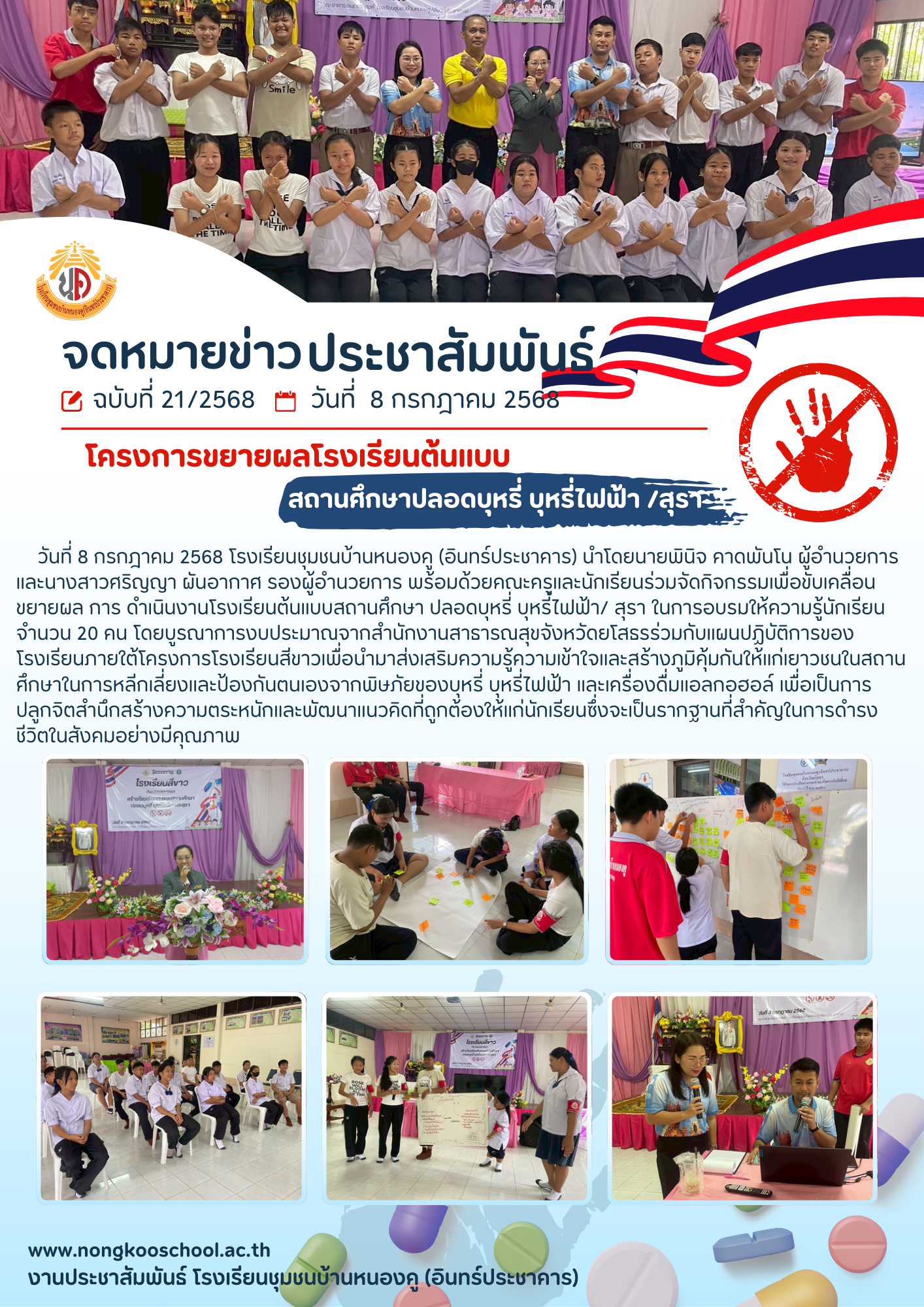 วันที่ 8 กรกฎาคม 2568 โรงเรียนชุมชนบ้านหนองคู (อินทร์ประชาคาร) นำโดยนายพินิจ คาดพันโน ผู้อำนวยการ และนางสาวศริญญา ผันอากาศ รองผู้อำนวยการ พร้อมด้วยคณะครูและนักเรียนร่วมจัดกิจกรรมเพื่อขับเคลื่อนขยายผล การ ดำเนินงานโรงเรียนต้นแบบสถานศึกษา ปลอดบุหรี่ บุหรี่ไฟฟ้า/ สุรา ในการอบรมให้ความรู้นักเรียน จำนวน 20 คน โดยบูรณาการงบประมาณจากสำนักงานสาธารณสุขจังหวัดยโสธรร่วมกับแผนปฏิบัติการของโรงเรียนภายใต้โครงการโรงเรียนสีขาวเพื่อนำมาส่งเสริมความรู้ความเข้าใจและสร้างภูมิคุ้มกันให้แก่เยาวชนในสถานศึกษาในการหลีกเลี่ยงและป้องกันตนเองจากพิษภัยของบุหรี่ บุหรี่ไฟฟ้า และเครื่องดื่มแอลกอฮอล์ เพื่อเป็นการปลูกจิตสำนึกสร้างความตระหนักและพัฒนาแนวคิดที่ถูกต้องให้แก่นักเรียนซึ่งจะเป็นรากฐานที่สำคัญในการดำรงชีวิตในสังคมอย่างมีคุณภาพ