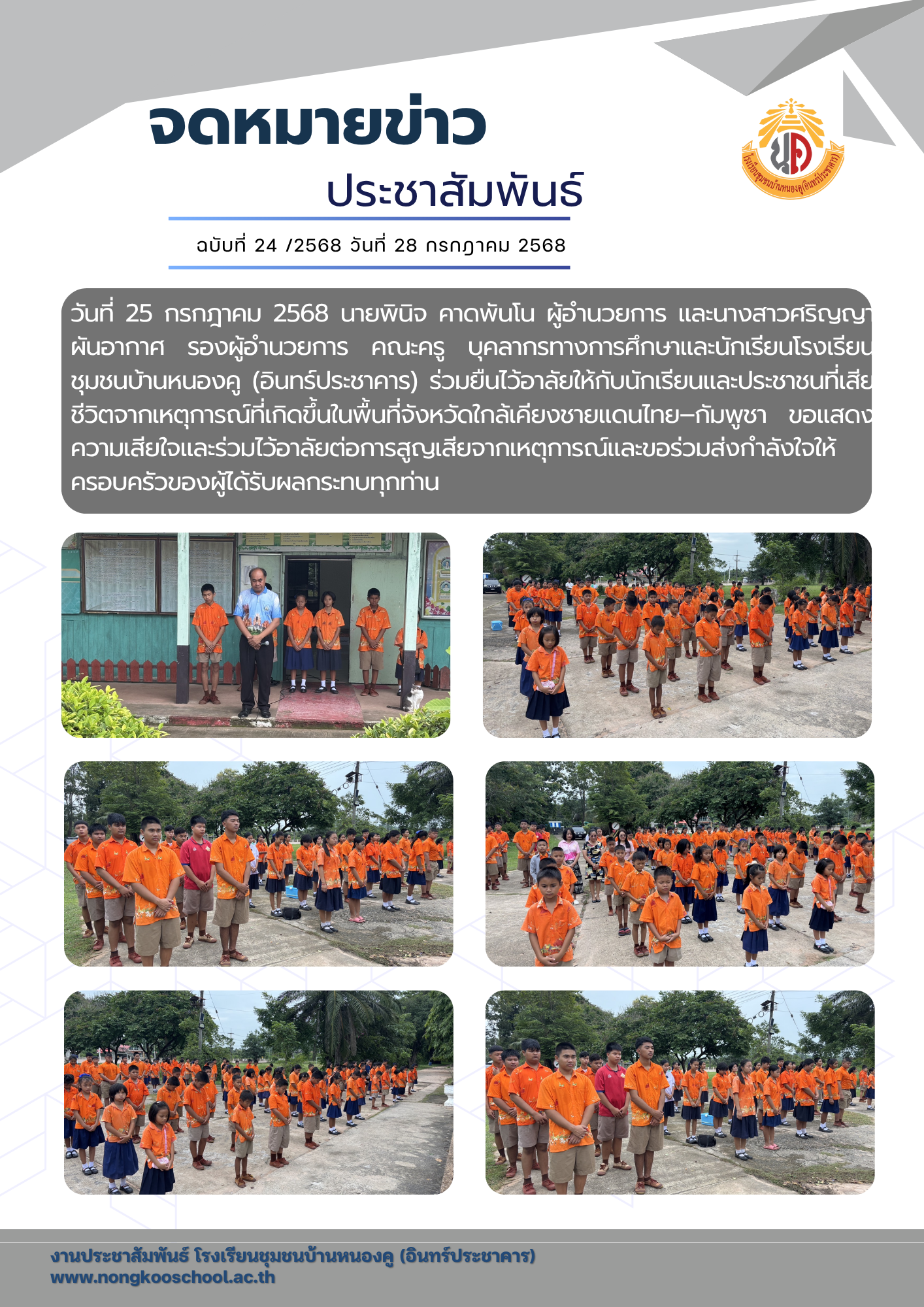 วันที่ 25 กรกฎาคม 2568 นายพินิจ คาดพันโน ผู้อำนวยการ และนางสาวศริญญา ผันอากาศ รองผู้อำนวยการ คณะครู บุคลากรทางการศึกษาและนักเรียนโรงเรียนชุมชนบ้านหนองคู (อินทร์ประชาคาร) ร่วมยืนไว้อาลัยให้กับนักเรียนและประชาชนที่เสียชีวิตจากเหตุการณ์ที่เกิดขึ้นในพื้นที่จังหวัดใกล้เคียงชายแดนไทย–กัมพูชา ขอแสดงความเสียใจและร่วมไว้อาลัยต่อการสูญเสียจากเหตุการณ์และขอร่วมส่งกำลังใจให้ครอบครัวของผู้ได้รับผลกระทบทุกท่าน