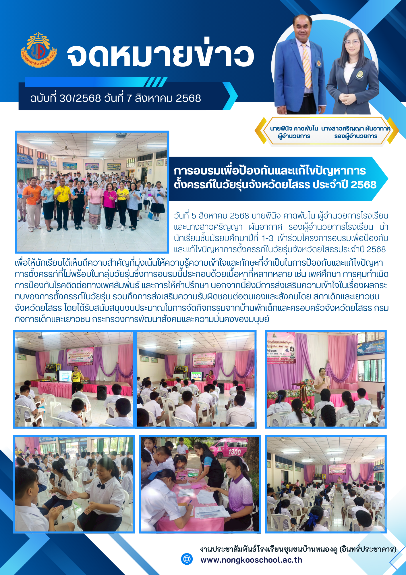 นที่ 5 สิงหาคม 2568 นายพินิจ คาดพันโน ผู้อำนวยการโรงเรียนและนางสาวศริญญา ผันอากาศ รองผู้อำนวยการโรงเรียน นำนักเรียนชั้นมัธยมศึกษาปีที่ 1-3 เข้าร่วมโครงการอบรมเพื่อป้องกันและแก้ไขปัญหาการตั้งครรภ์ในวัยรุ่นจังหวัดยโสธรประจำปี 2568 พื่อให้นักเรียนได้เห็นถึความสำคัญที่มุ่งเน้นให้ความรู้ความเข้าใจและทักษะที่จำเป็นในการป้องกันและแก้ไขปัญหาการตั้งครรภ์ที่ไม่พร้อมในกลุ่มวัยรุ่นซึ่งการอบรมนี้ประกอบด้วยเนื้อหาที่หลากหลาย เช่น เพศศึกษา การคุมกำเนิด การป้องกันโรคติดต่อทางเพศสัมพันธ์ และการให้คำปรึกษา นอกจากนี้ยังมีการส่งเสริมความเข้าใจในเรื่องผลกระทบของการตั้งครรภ์ในวัยรุ่น รวมถึงการส่งเสริมความรับผิดชอบต่อตนเองและสังคมโดย สภาเด็กและเยาวชน จังหวัดยโสธร โดยได้รับสนับสนุนงบประมาณในการจัดกิจกรรมจากบ้านพักเด็กและครอบครัวจังหวัดยโสธร กรมกิจการเด็กและเยาวชน กระทรวงการพัฒนาสังคมและความมั่นคงของมนุษย์